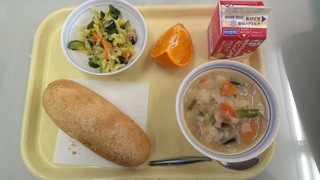 本来は、ビーツによる鮮やかな赤い色が特徴ですが、給食ではトマトで赤色に仕上げました。
