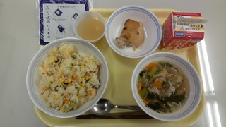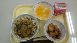 本日は、大森第三小学校101回目の開校記念日です。お祝いの気持ちを込めて、うどんに「祝」の字のなるとを入れました。人気のメニューを組み合わせたこともあり、よく食べてくれました。
