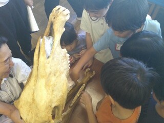 研究授業では、歯に興味をもってもらうために、実際にライオンとシマウマとサルの頭骨を見て、歯の数や形、大きさの違いを発見しました。その後、手鏡で自分の歯を観察し、前歯と奥歯の違いやそれぞれの歯の役割について考え、交流しました。普段、何気なく見たり触ったりしている歯ですが、よく観察すると奥歯に溝があること、犬歯はライオンの牙に似ていることなど、たくさんの気付きが出てきました。今後は、歯の健康維持のための学習に入っていきます。