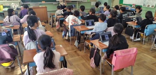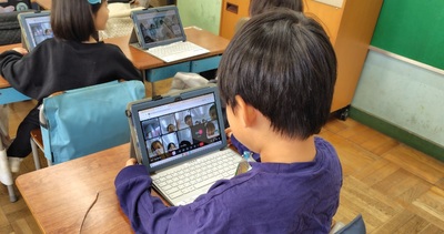 1年生でも使い始めました。11月にインフルエンザの猛威におそわれ、学級閉鎖となったこともあって、オンライン授業に慣れるために、みんなでGoogleMeatにつないでみました。先生やお友達の顔が画面に映し出されると、たちまちみんな笑顔になりました。