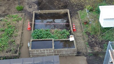 写真3の第3水田は、学校園委員が育てているサツマイモを収穫した後で、再び作業開始となります。こちらは周囲の地面とつながっているため、なんと田んぼ枠の壁面を突き破って、植物の根が侵入している状態。壁面の修繕をするよりも、新たに四角い枠組みをしたプールライナーを張り巡らし、水中ボンドで完全固定するという方法で防水する計画を立てています。