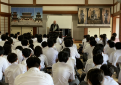 薬師寺に到着しました。ここでは、お坊様からお話を聞くことができます。薬師寺のことにとどまらず、自分たちのことを真剣に考えて、未来にむけてがんばろうと、楽しく背中を押していただきました。これまでに幾多の3年生がこの法話を聞いてきました。みんなも真剣に聴いています。