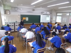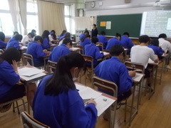 3年生は真剣に取り組んでいます。出題は授業でやってきた小説文の問題、本文に目を通しつつ問題を考えるので、冊子のページを行きつ戻りつします。次は、俳句の鑑賞文、今ままでに授業で考えてきたものを材料に自分の中で再構築して、文章を作ります。こうしてみると、テストの50分の中だけでなく、これまでの積み重ねが大切だと改めて思いました。