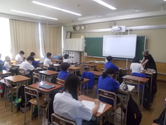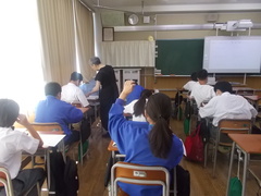 先週、定期考査で出題した文字式の計算の復習から入っています。6問で3分間です。解く手順がわかっていれば、だんだんと式の形を変えて答えにしていけるのですが、身についていたでしょうか。先生も個別に教えてくれています。数学の文字式の手順は、これからの方程式などこれからの数学で必要な、とても大切なものです。必ず復習して身につけましょう。