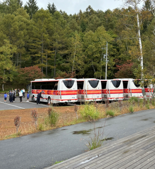 横谷観音の駐車場までやってきました。止まったバスの中で昼食で、午後のオリエンテーリングに備えます。外の天気、今は雨は上がっていますが、これからの天候に期待しましょう。