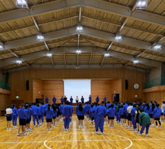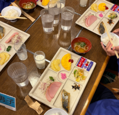 旅先での起床時間は6時10分、着替えて体育館に集合です。ラジオ体操で身体を目覚めさせたら、朝ご飯。今日は班行動で、アスレチックです。身体も動かしますから、しっかり食べて、1日を元気に過ごしましょう。