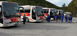 いよいよ出発です。今日は青空ものぞき、よい天気です。。バスに乗車して国際自然大学校に向かいます。1日野外で過ごす活動です。高原での自然に接して、リフレッシュできるととよいですね。