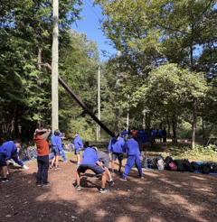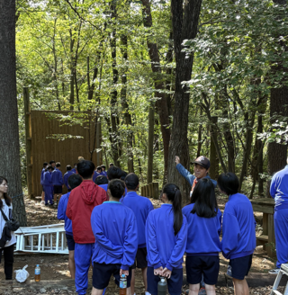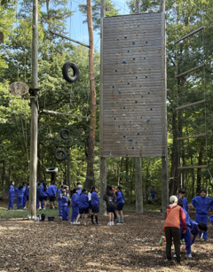高原の自然の林の中を巡りながら、さまざまなアスレチックの課題に取り組んでいきます。一緒にインストラクターの方がガイドしていただけます。準備運動して、それでは巡っていきましょう。