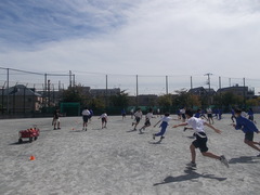 授業でフラッグフットボールに取り組んでいます。互いの腰につけたタグの取り合いをしますが、相手を追いかけて、組み合ってと、校庭全体を使った壮大な鬼ごっこのようです。快晴の青空の下、思う存分に走り回ります。秋の空気の中で、汗ばむくらいに体を動かすことができました。