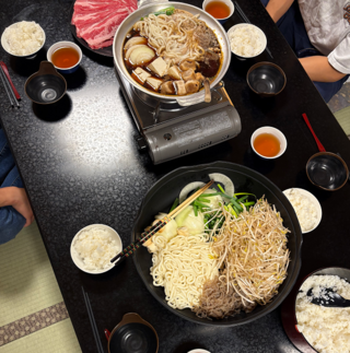 夕食は、定番のすき焼きです。それにしてもおいしそうです。旅先で食べる料理は格別ですね。今日はたくさんの土地やポイントを訪ねました、思い出を振り返りながら、おなか一杯食べて、疲れを癒して、また明日に備えましょう。それではいただきます。