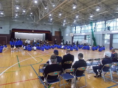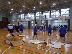 2年生は、まずは、体育館で班ごとに集合です。地域の方々にもおいでいただき、みんなの訓練の様子をお手伝いいただきます。担架で運んだり、体育館に毛布を引いたり、仮設トイレを組み立てたりとさまざまな体験をしました。実際にやってみると、難しかったり、想定していないことがあったりと、訓練の大切さがわかります。