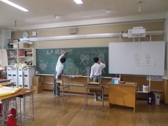 合唱コンクール当日の早朝、教室の黒板にクラスのみんなの思いを描く生徒たち、昨日からの準備で朝練習の前に仕上げの作業です。今日の晴れ舞台で、これまでの練習の成果が発揮できるとよいですね。正門の立看板も設置され、会場も整い、あとはみんなの歌声が響くのを待つだけ、今日一日、大森第三中学校は素敵なハーモニーに包まれます。