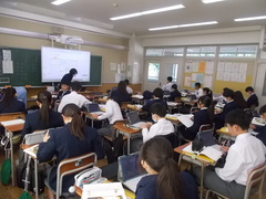 1年生の国語は、文学小説に入ってきました。まずは一回朗読を聞いて、印象に残ったことや疑問点などを出し合います。タブレットを使って、それぞれの点について自分の考えを出し合っていきます。考えたことを相手に伝え、発表するために、文章を考えて打つことが必要で、それは一回自分の考えを整理する機会にもなります。