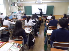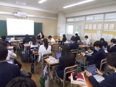1年生の英語の英語の授業、タブレットを活用して学習を進めます。新出単語の練習はクイズ形式で、この単語が出てきたら意味はこれと、反復して覚えます。また、教科書の本文も電子教科書で音声にあわせて読み進めます。ただ、テストは筆記です。まずは、英文が書けることはとても重要、書く習慣を大切にしながら、授業はすすみます。