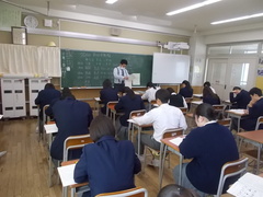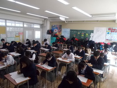 冒頭はリスニングがあります。放送で聞こえてくる問に答えます。生徒のみんなの目は問題用紙に、そして放送に耳を欹てて解答していきます。そして「以上で放送を終わります」とともに、今度は問題文に向かいます。ページをめくる音が聞こえてきて、次の問題へ進んでいるのが分かります。さぁ、2年生頑張って長文読解まで進んでいきましょう。