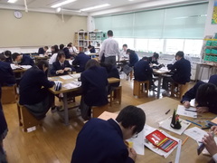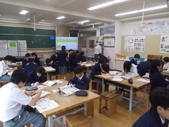 和の模様について、アイデアを組み立てています。繰り返しのデザインは、規則的にならべることで、美しさが出てきます。また未来につづくとか、たくさん取り入れるなど、縁起を担いだ由来があったりします。すてきなデザインを作って、伝統のデザインを感じ取ってください。みんな、一生懸命にデザインを書き込んでいました。