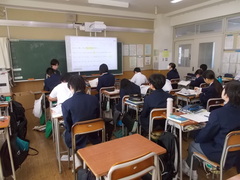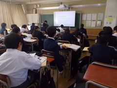 英語の授業、1年生は一学期にアルファベットを学習していたのが、大きな進歩です。授業中に、電子黒板に映した英文に、一文ずつ先生が解説してくれています。話しながら教科書の文章で確認したり、この場合はどうだろうかなど文章をいじってみると、英語の構文がわかってきます。自分たちから学習に取り組んでいく姿勢を大切にかんばりましょう。