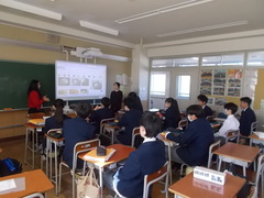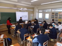 2年生の英語の授業の出だし、ALTの先生がネパールについて英語で紹介してくれています。食べものこと、とても有名なエベレストのこと。みんな興味津々でALTの先生の話に耳を傾けています。エベレストの頂上はどんな景色が広がっているのでしょう。気持ちが盛り上がってきたところで、「open your textbook~」