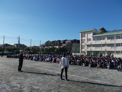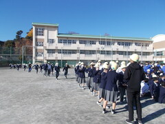 今回、昼休みに突然に校内から火災発生という想定です。昼休みで、みんなはさまざまな場所で過ごしています。そうした中、情報は放送による指示だけです。緊急を知らせる放送は、自分の身を守るシグナルです。まずは耳を傾け、そして速やかに整然と指示に従い避難をすることが必要です。訓練を通して、防災の意識を高めていきましょう。