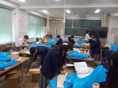 1年生の技術の授業で、本棚を制作しています。自分で考えた形にするために、パーツに切り取る線を引いたり、のこぎりで切りだしたり、切り出したパーツをやすり掛けして表面を整えたり、みんな自分の作業に没頭しています。丁寧に仕上げておくと、このあとニス塗など仕上げの見栄えがよくなります、丁寧な作業をがんばりましょう。