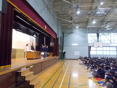 終業式に続いて表彰を行いました。夏休みからこの2学期にかけてのみんなの頑張りがたくさんありました。部活動などの大会での入賞や、作品や作文、ポスターや標語、研究発表など、日ごろの学習の成果の表彰、そして地域の中で活動した成果など、大森第三中学校の生徒のみんなの活動が多岐にわたっていることを実感できる機会となりました。今後のそれぞれの活動の場で、自分たちの力を発揮して、充実した活動を進めていきましょう。
