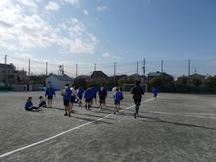 1年生の体育の授業、持久走に取り組み始めます。今日は最初の授業で、8分間走に取り組みます。自分の走力を知ろうという目標で頑張ります。時間内で10周くらい走れたようです。冬の冷たい空気の中、みんな一生懸命走りました。外で走ると景色が変わっていくので、先へ先へという気持ちになります。今日は担任の先生も参加、みんなで校庭を走りました。