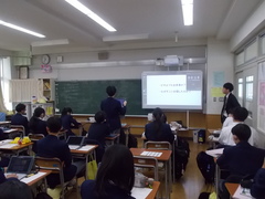 3年生の社会の時間、世界の平和をテーマに過去や現代の国際紛争について調べたものを発表しました。コンパクトに自分が調べた内容を発表し、クラスのみんなで共有します。3年生は入試などもあり、緊張感の中ですが、みんなが揃って授業を受けるいつもの教室は、ちょっと安心感に包まれているように感じました。
