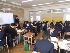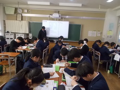1年生の理科では、地震についての授業です。コンパスを使いながら、地図の中で震央を探しています。観測ポイントがたくさんあると精度があがります。実際には今日取り組んだ作業を、瞬時に行い地震速報で流していることに気づき、科学のすごさや観測網の精度に感動していました。結果がどうやってはじき出されているのかを知ることはとても大切ですね。