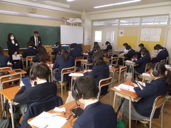 1・2年生は、ESAT-Jに取り組みました。各クラス1時間を使い、専用のタブレットを使って回答します。日頃の学習でどれくらい話せるようになり、自身についている話す力の確認するためのテストです。このテストは東京都全体で実施しているので、客観的に自らの力がつかめる機会ともなります。みんな、落ち着いて取り組んでいました。