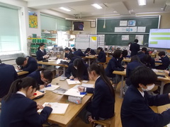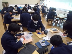 1年生の美術の時間、切子デザインに取り組んでいます。模様のデザインを決めたら、切子シートにデザインを写して、彫刻刀で削っていきます。厚手のビニールの板に彫るので、彫刻刀の扱いには十分に注意しながらの作業です。デザインが彫りあがってくるのは励みになります、みんな黙々と集中して作業に取り組んでいます。