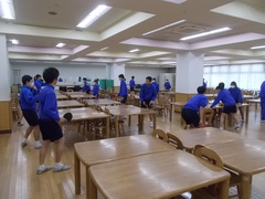 土曜日の学校公開と昨日の日曜日は、雪でした。そのために、校庭も今日はぬかるんでいて、2年生の体育の授業は、食堂で卓球になりました。テーブルとイスを使って即席の卓球台を作り、楽しんでいます。なんとか相手に返しつつ、ラリーも続いているようです。テーブルテニスという語源の通りの状況ですね。