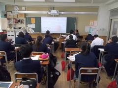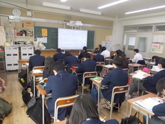 2年生の社会、北海道もまとめ、これまでに学習してきた内容をプリントでまとめています。使う言葉も正確に書いていくことが必要です。プロジェクタで写したものを、順番に問いに先生が説明しながら、進んでいます。みんな、自分のプリントの語句が正しいか、話を聞きながら確認しています。集中して取り組んでいる様子がよいですね、頑張っていきましょう。