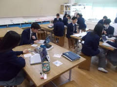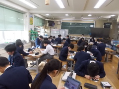 3年生の美術の時間、俳句の色紙づくり、国語で考えた俳句を色紙に書いて、デザインを考えています。明日からは3日間の予定で定期考査があり、そして来週末が作品展となります。今取り組んでいる作品は、この展示発表で展示される予定です。制作にとれる時間は少ない。そうした中で、すてきな作品を仕上げていきましょう。