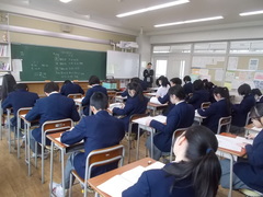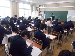 チャイムとともに試験が始まります。先生の号令の合図で、みんな一斉に問題用紙を開き、問題に目を落とします。試験開始からしばらく、リスニングを知らせる放送が入った瞬間、みんな顔を上げて放送に耳を欹てます。すぐに問題に目を落としメモを取りながらリスニングに取り組んでいきます。2年生のみんな、聞き落とさないよう、真剣に頑張っています。
