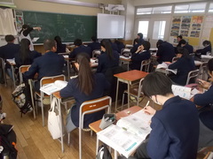 2年生の理科の授業は、電流と磁界の関係です。右手の方向に流れるとその周囲に磁界ができるというところを、右手の向きを変えつつ、いろいろな状況のときのことを図に書き込みました。図示したり観察イラストを描いたりすることで、仕組を把握することができます。今回の展示発表でも、学習で取り組んだ成果が、掲出されています。これからも頑張ろう。