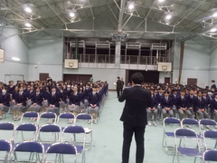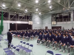 卒業式の予行を前にして、1年生と2年生が体育館に集まって、礼法や所作についてのお話があります。実際に300名以上の生徒が集まっての所作となるので、集中して気持ちを一つにすることが大切です。お世話になった先輩方へ感謝の意を込めた態度、自分たちの1年後を考える機会として、卒業式に参加できるようお話がありました。