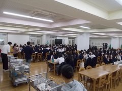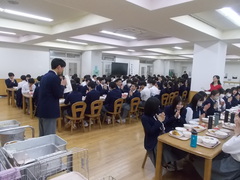 3年生の最後の給食は、学年全体で給食をとることになりました。食堂で、一つの学年が一一堂に会して給食をとるのは、ほんとうに久しぶりのことです。毎回の給食で、献立紹介や号令をかけてくれた給食委員さんがいつものように号令をかけます。3年間の給食の準備をしてくださいました調理室のみなさんにも感謝して、それでは「いただきます」