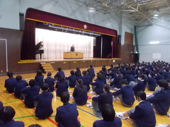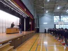 今体育館で整列しているのは、来年度学校を引っ張る2年生と中堅になる1年生です。この修了式でお渡しした修了証は、みんなの努力の結果、学習や運動、部活動で実績が記録されているものです。この1年間、みんなが頑張った結果でするので、受け止め次の学年でどうするか、考える材料としてください。さて今日は、コミュニティスクールとして学校を地域とともに作っている学校運営協議委員の方々も参加してくださっています、大森第三中学校の生徒は、学区の中心として新井宿を束ね、地域の一員としてのワンピースとしての力、役割を自覚してプライドをもって活躍してくれるといいなと思います。みんなの活動の様子は、地域の人たちも認めてくれています。これからも、自分のこと、勉強や運動など日常で取り組んでいることを、まずはしっかりやりつつ頑張ってほしいと思います。4月からは1年生かたくさん入学してきます。みんなもそれに圧倒されないように、リードしていきましょう。3年生は、最後の一年、2年生は中堅と、それぞれ学年もすすみ、立場も変わり、今後のことを振り返りつつ、大森第三中学校を盛り立てていってください。