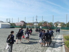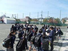 進級して2年生と3年生になった在校生のみんなが登校してきました。いよいよ令和8年度の学校生活のスタートです。まずは、校庭で新しいクラスの名簿を受け取ります。時間になると先生が配布を始めました。みんな駆け寄ってプリントを受け取ります。みんなの一年間の門出を象徴する青空のもと、新たな気持ちで学校生活をスタートさせましょう。