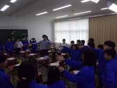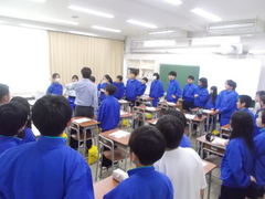 午前中、中学生になっての作文で、自分のことをしっかりと考えて、午後は委員や係などを決めます。ちょうど間の3時間目、学級の仲間を知ろうとレクリエーション。しゃべらずに互いに伝えあい生年月日順に並んでいきます。同じクラスの仲間、協力して取り組むことは、学級生活でもとても大切。こうして互いを知り、学級組織づくりにつなげていきましょう。