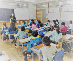 2年生、3年生、4年生の学習の様子です。2年生は音楽。「かくれんぼ」の合唱をするところです。3年生は外国語活動として、外国人講師がネイティブな発音をすることでこどもたちの意欲を高めています。また、4年生は図工。家族や友達に送るカード作りに集中していました。