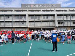 今日は、8:30から全体練習が行われました。開閉会式の練習です。涼しい風が吹いていたため、昨日のような暑さではありませんでした。代表児童による挨拶、応援団長による優勝旗、準優勝杯の返還・授与、そして歌に取り組みました。