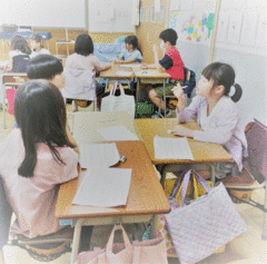 3年生と4年生の様子です。前者は道徳。「自然愛護」について自分の考えを深めます。ワークシートに自分の考えをまとめ、グループでそれらを伝え合っているところです。自分にはなかった考え方に気付き、考えが深まります。後者は「読書標語」について考える学習でした。こちらも自分の考えた標語をグループで伝え合っています。どうしてこういう標語にしたのか、理由をつけて発表できるとなおよいです。もうひとつは図工です。展覧会に備え作品作りに励んでいます。
