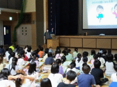 午後は、3年生が体育館で食育の学習をしました。講師は栄養士です。タイトルは「バランスのよい 朝ご飯を食べよう」。スライドや動画を駆使した説明に、こどもたちは集中して見たり聞いたりメモをとったりしていました。