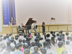 5時間目に体育館からきれいな音色とこどもたちの歓声が響いてきました。昨年に続いて某市の観光大使を務めておられるご兄弟が来校され、歌やヴァイオリンの曲を聴かせていただきました。よい音楽は心が安らぐとともに快くしてくれます。貴重な時間になりました。ありがとうございました。