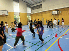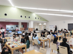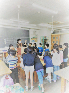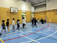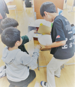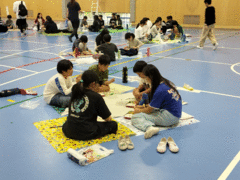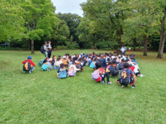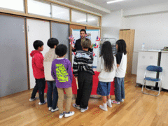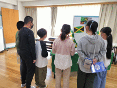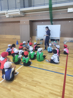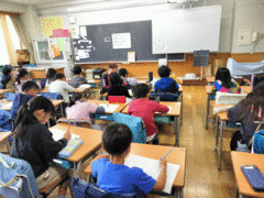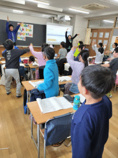 1年生の体育の授業です。サッカーにつながるボールを蹴る学習でした。(1)ハードルを通すために強く蹴ること(距離は選択できる)(2)班で蹴ったボールを段ボールに当てて動かすゲーム(3)ゲーム後の振り返り(作戦会議)この3つをローテーションしていく内容です。あっという間に時間が過ぎ、こどもたちからは「あ~楽しかった」「またやりたい」など意欲的な声が聞こえてきました。次は「イングリッシュ・キャラバン」の様子です。各ブースでこどもたちは外国人講師と英会話をします。英語に親しむ最高の機会となっています。最後は2年生の外国語活動の様子です。アルファベットの歌を体で表現しながら、元気よく歌っています。そのほか、ハロウィンにちなんだ歌を鑑賞し、教師の後に発音しました。