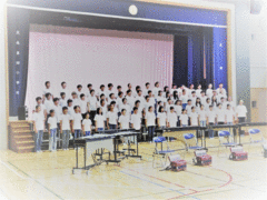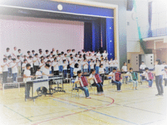 移動教室から帰ったばかりの5年生ですが、次は再来週に迫った連合音楽会への出場が目標です。2時間目には体育館で音楽専科から説明があり、実際の隊形を学んだあと、合奏を行いました。