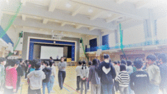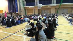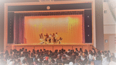 今日は、日本の伝統芸能を学ぶ場として大槻能楽堂の方々をお招きしました。昨日午後から舞台の準備をされ、体育館が生まれ変わったようになりました。なかなか経験できない機会です。文化庁の舞台芸術支援事業に応募し当選したものです。代表児童による体験もありました。