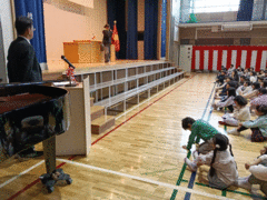 3学期の始業式を実施しました。児童代表は3年生でした。私は、午年に期待することや正月に観たディズニー映画から友達のもつ自分との違いやよさを見つけ認め合うこと、互いの弱いところをカバーし合える仲間を目指すことを話しました。今日は「大四算数検定」「席書会」を行います。この後みらい学園の始業式に向かいます。