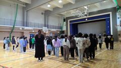 今日と来週は、地元のプロバスケットボールチームのコーチの方がバスケットボールの指導にお越しくださいました。今日は3年生が対象です。体育館を出るとき「あ~楽しかった!」という大きな声が聞こえてきました。その様子です。